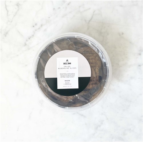 Ingredients: aubergines, sunflower oil, water, wine vinegar, sea salt,sugar, parsley, garlic, chilli, acidity regulator [citric acid (E330)], acidity regulator [glucono-delta-lactone (E575), firming agent [calcium chloride (E509), natural mint flavour