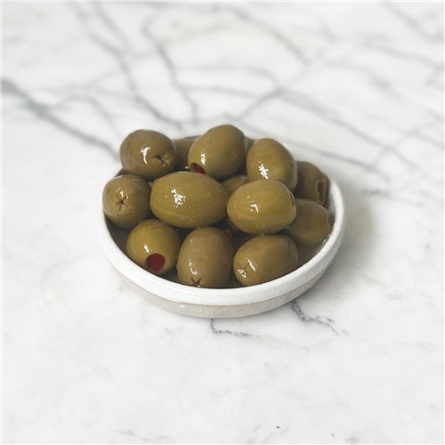 Ingredients: Stuffed Olives (Green Olives, Water, Red Pepper Stuffing, Salt, Stabilizer: Lactic Acid) Brine contains [Water, Rapeseed Oil]