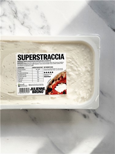 Ingredients:Mozzamara - mother culture, SOYA MILK (SOYA beans water), coconut oil, water, fine sea salt, psyllium fibre, acidity regulator: lactic acid, stabilisers: xanthan gum, carrageenan kappa Superstraccia Cream - mother culture, coconut oil, water, fine sea salt, dextrose, emulsifier: soya lecithin (SOY), stabilisers: xanthan gum.