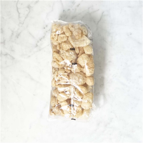 Ingredients: Pork Crunch ( Pork Rind, rusk (WHEAT), hydrolysed vegetable protein (SOYA), yeast extract, salt, sugar, dextrose, rapeseed oil)