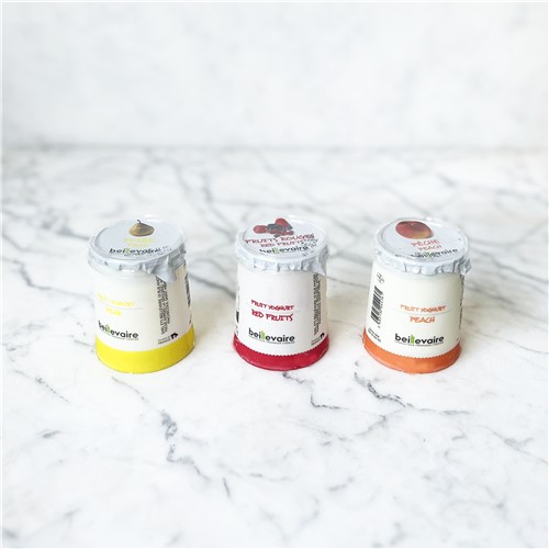 Ingredients:Red Fruit Yogurt (Whole milk, red fruits 8.9% (strawberry, blackberries, raspberries, blueberries), sugar, powder skim milk, lactic ferments, two gelling agents (carageenan, pectin), aroma, potassium sorbate E202) Pear Yogurt (Whole milk, fruit in average 8.9%, sugar, powder skim milk, lactic ferments, two gelling agents (carrageenan, pectin) aroma, potassium sorbate E202) Peach Yogurt (Whole milk, fruit in average 8.9%, sugar, powder skim milk, lactic ferments, two gelling agents (carrageenan, pectin), aroma, potassium sorbate E202).