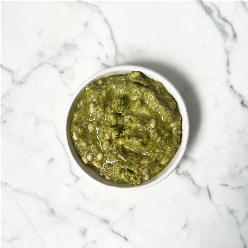 Ingredients: Basil Paste (43.6%) contains Basil, Sunflower Oil, Salt, Antioxidant [Ascorbic acid (E300)], Extra Virgin Olive Oil Parmesan Reggiano contains Unpasteurised Cow?s Milk, Salt, Animal Rennet. Pine Nuts (15.8%) Rapeseed oil Garlic Puree Acidity Regulator [Citric acid (E330)]